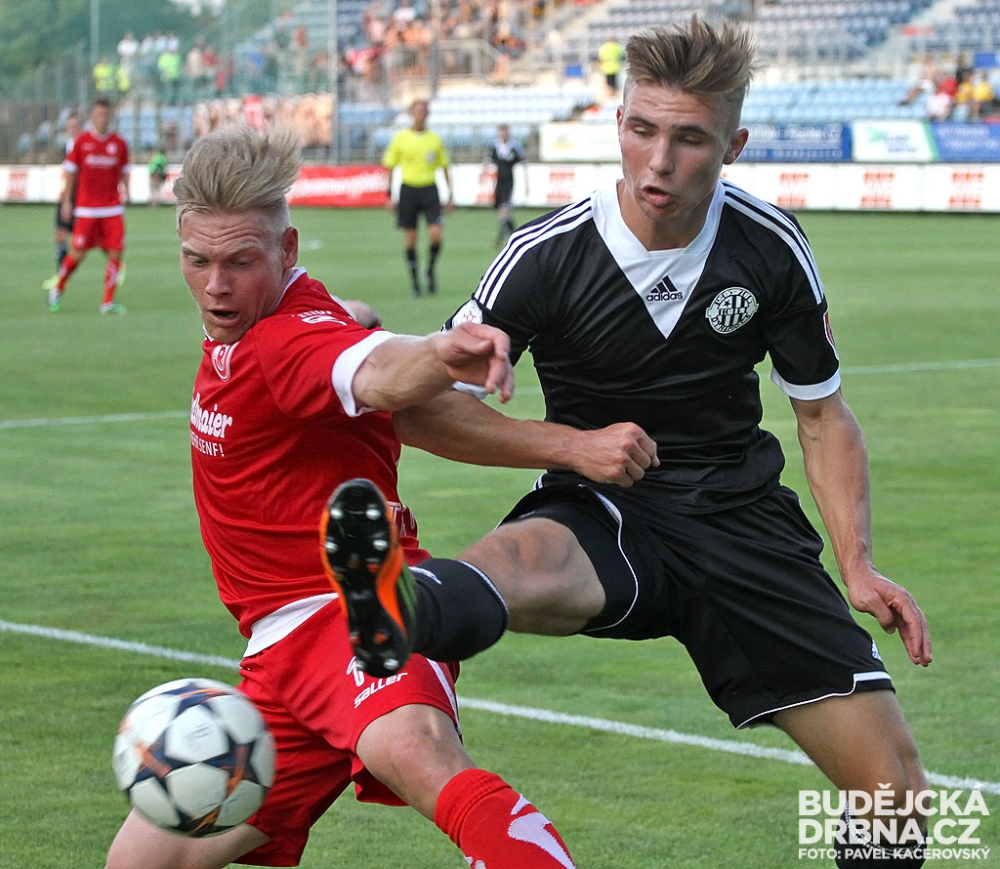 Domácí útočník Zdeněk Linhart (vpravo) v souboji s autorem prvního gólu Fabianem Trettenbachem
