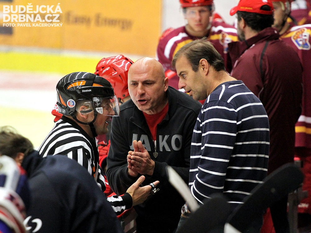 Jihlavský trenér Petr Vlk při emotivním rozhovoru s čárovým rozhodčím a Radkem Bělohlavem těsně před ukončením utkání