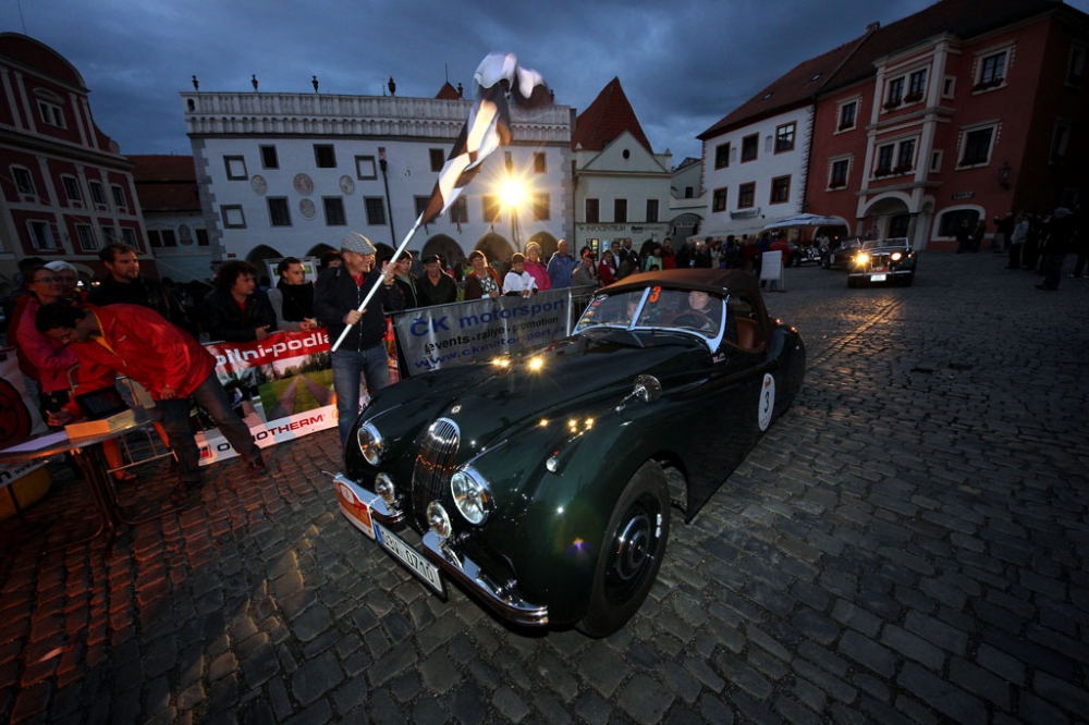 Jaguar XK 120 s Ivou Pavlíčkovou za volantem na loňském startu v Českém Krumlově. Foto Dalibor Benych