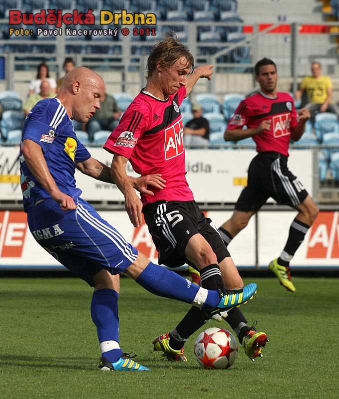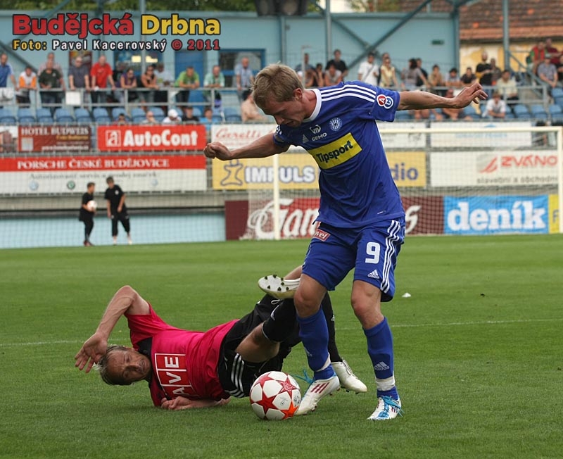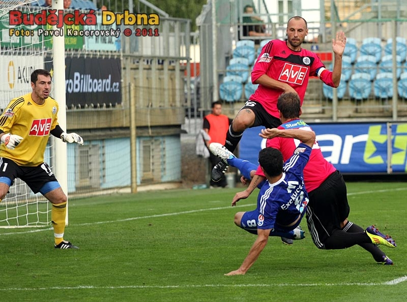 Ležící Rudolf Otepka se snaží připravit o míč hostujícího Lukáše Bajera