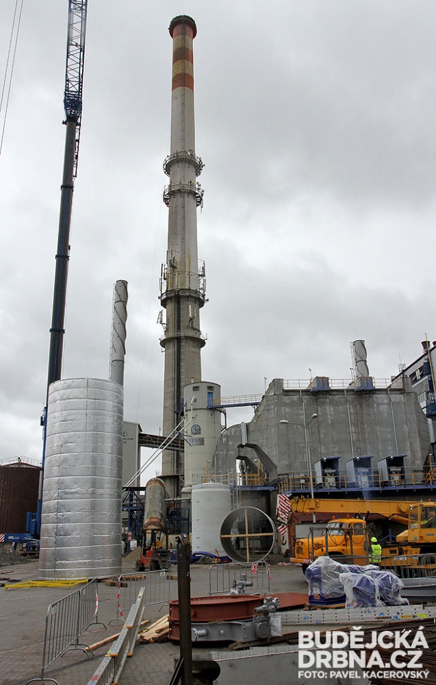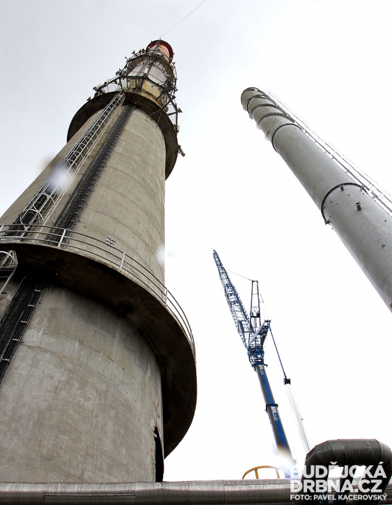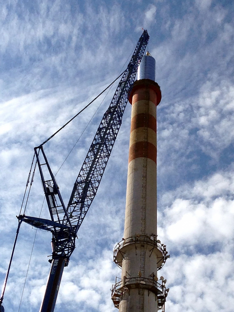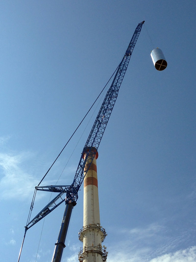 Jeřáb spouští do teplárenského komínu nerezovou vložku. Foto Martin Žahourek
