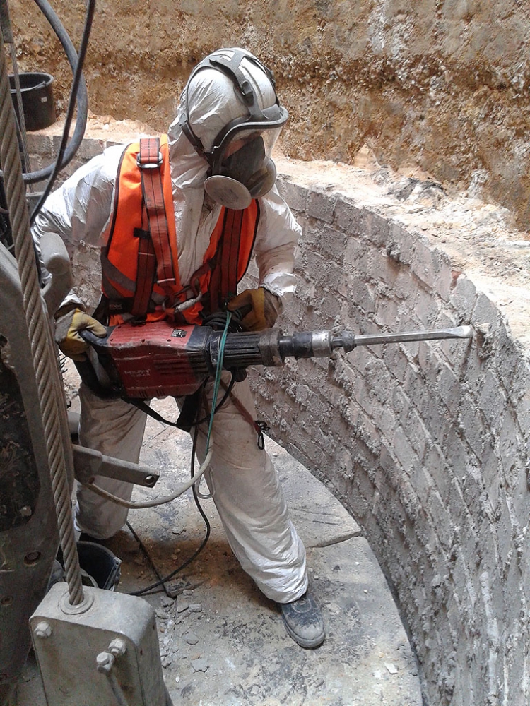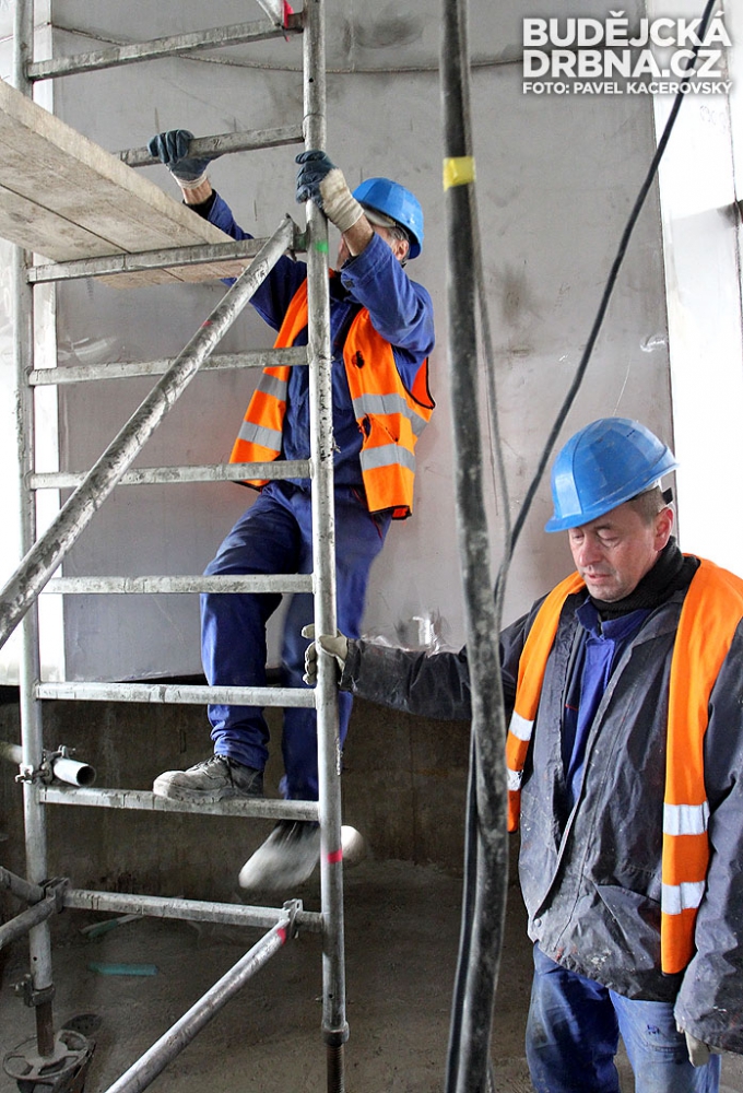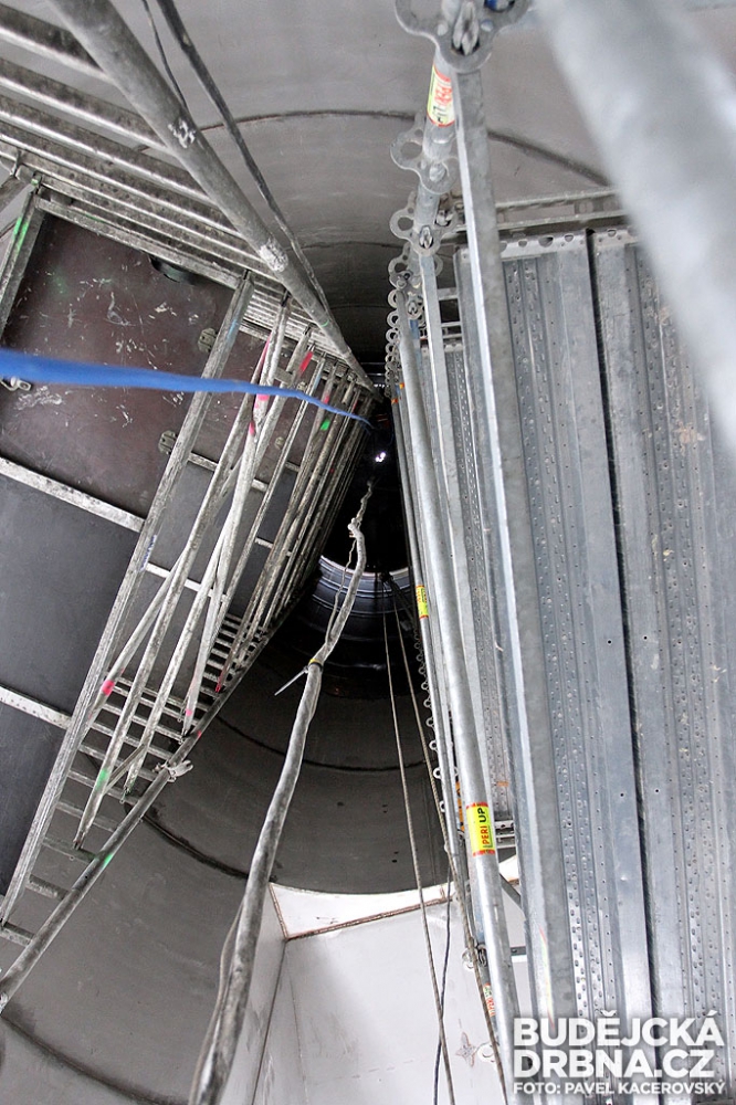 Dělníci se sbíječkami vybourali vnitřní ochranné pouzdro z tepelné izolace komínu. Foto Teplárna České Budějovice