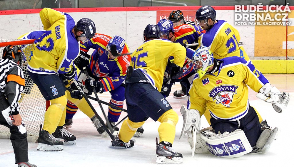 Jeden ze závarů před ústeckým gólmanem Volkem. Velkou šanci měl Tomáš Nouza