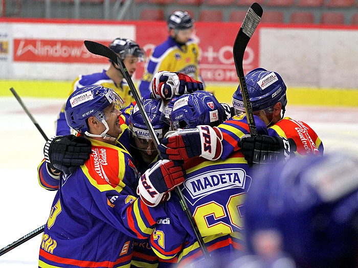 Radost hokejistů Motoru po vstřelené brance