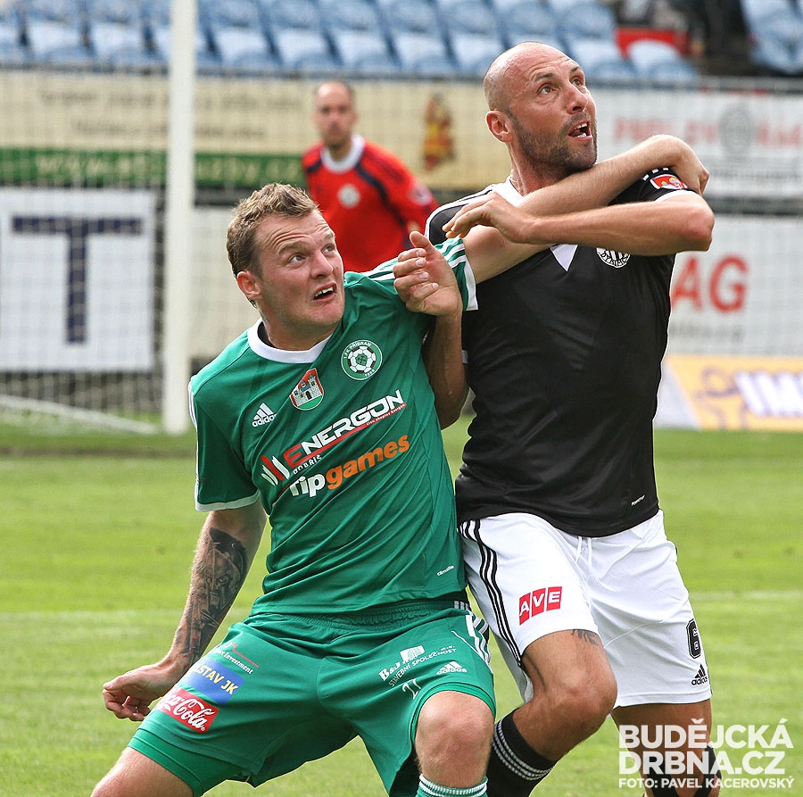 O jediný zásah do sítě Dukly Praha se postaral Roman Lengyel (na snímku vpravo s příbramským Řezníčkem)