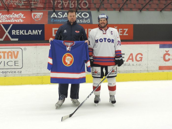 Kapitán Josef Straka a prezident klubu Roman Turek (zprava) představují retro dresy, ve kterých se bude hrát