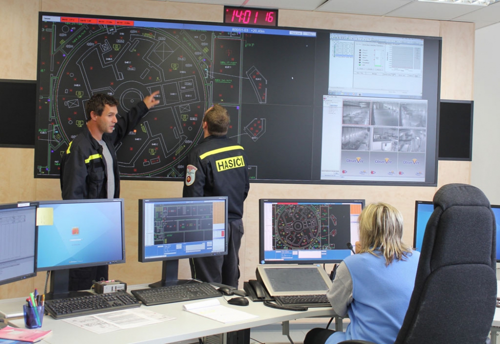 Moderní velkoplošná obrazovka přehledně zobrazuje požární situaci v areálu elektrárny Temelín
