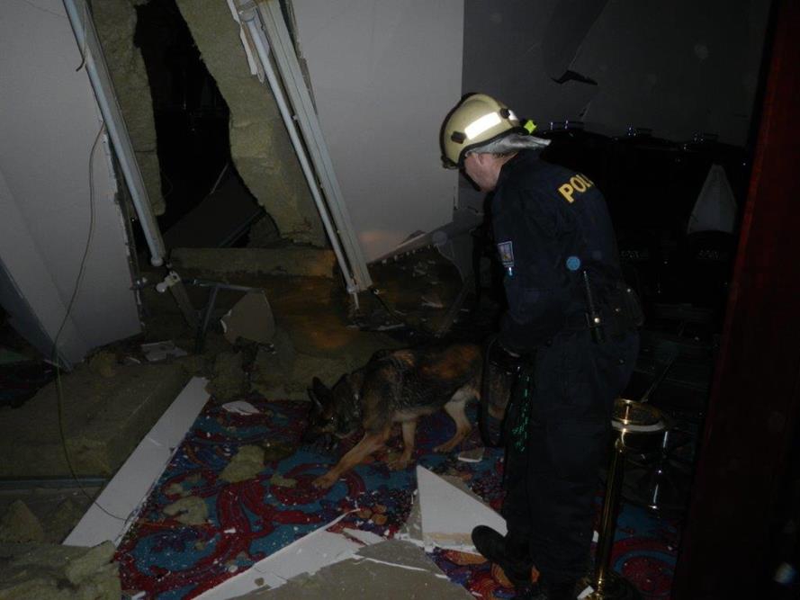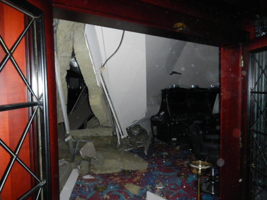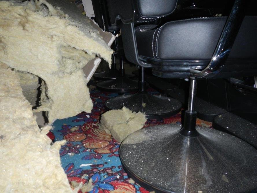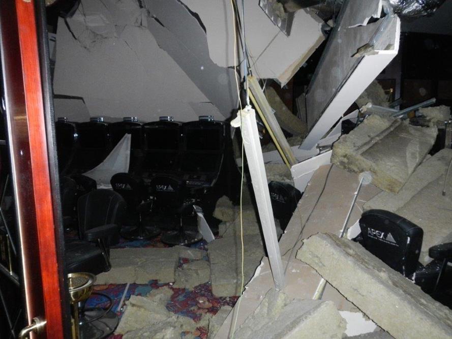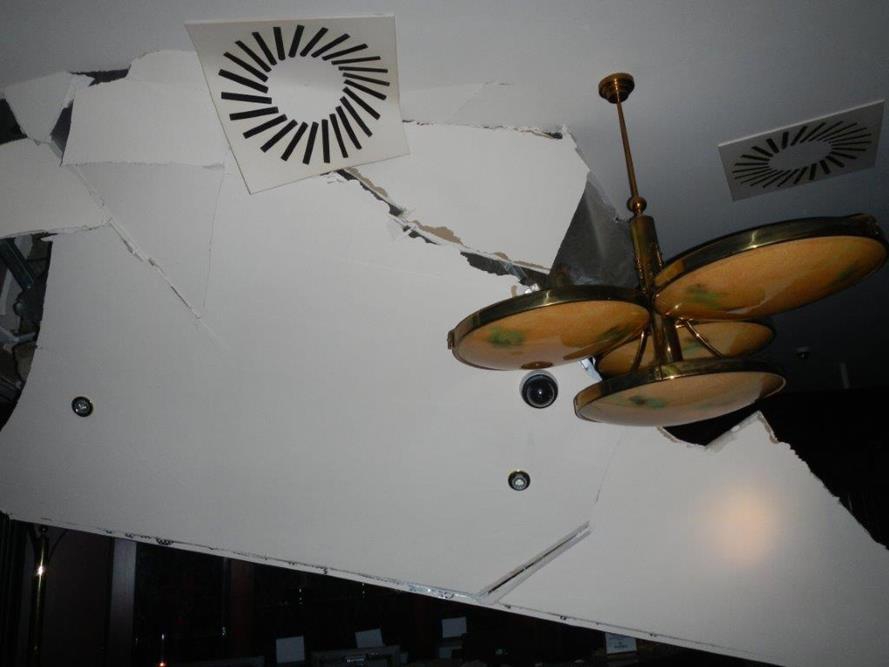 Zřícený sádrokartonový strop kasina ve Strážném
