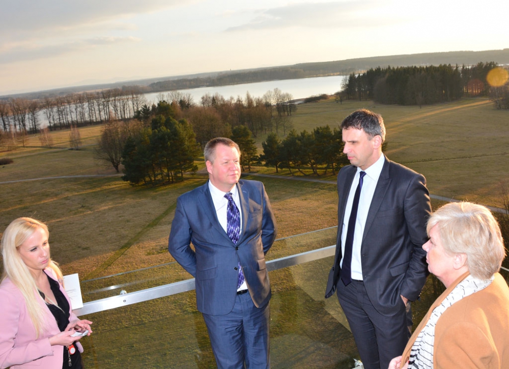 Ministr zdravotnictví Svatopluk Němeček, hejtman Jiří Zimola a jeho první náměstkyně Ivana Stráská na vyhlídkové plošině v devátém patře lázní Aurora v Třeboni. V pozadí je rybník Svět
