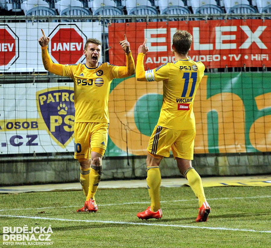 Oba jihlavští střelci - Lukáš Vaculík (zády) a autor třetí trefy Muris Mešanovič