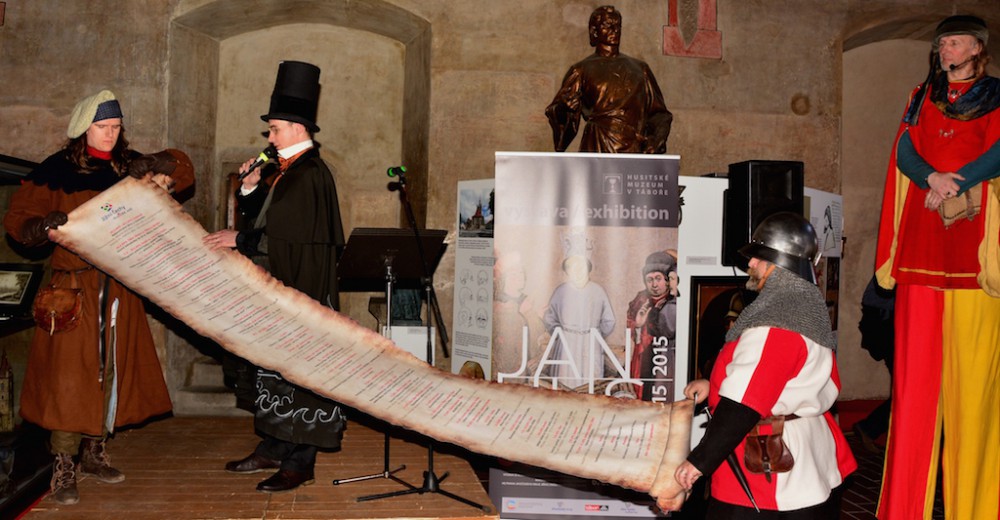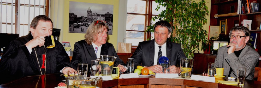 Na dotazy novinářů odpovídali na tiskové konferenci (zleva) patriarcha Tomáš Butta, starosta Tábora Jiří Fišer, hejtman Jiří Zimola a historik Petr Čornej.