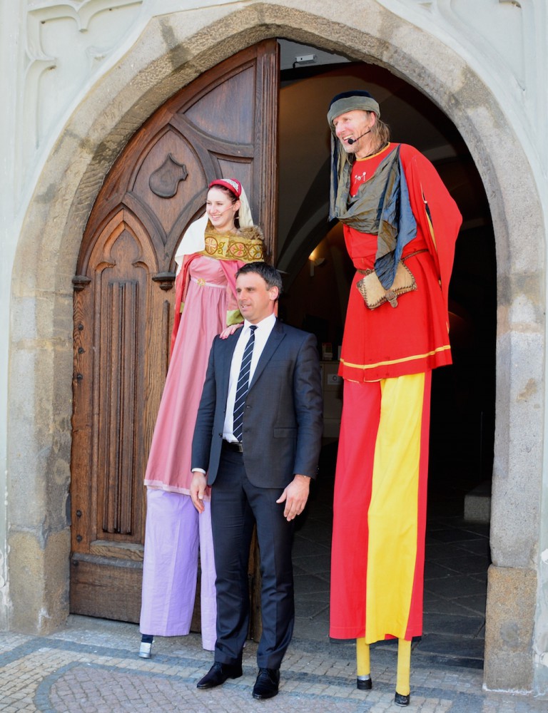 Hejtman Jiří Zimola sleduje v Gotickém sále Staré radnice v Táboře výjev z filmu Otakara Vávry Jan Hus