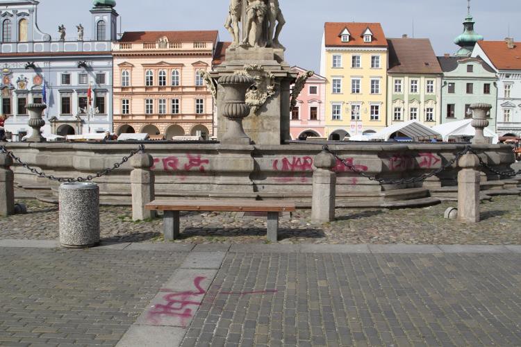 Noční řádění sprejera odnesla kašna, budova radnice i plavecký bazén