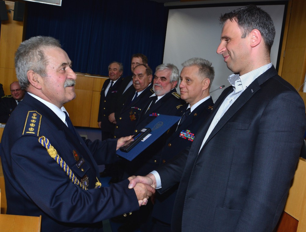 Starosta SH ČMS JčK Václav Žižka poděkoval hejtmanovi Jiřímu Zimolovi a celému kraji za podporu a předal mu medaili za zásluhy o sbory dobrovolných hasičů