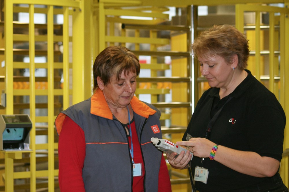 Členka ostrahy Marika Kohoutková vyzývá pracovnici vstupující do elektrárny k provedení dechové zkoušky. Tato kontrola byla stejně jako drtivá většina ostatních negativní