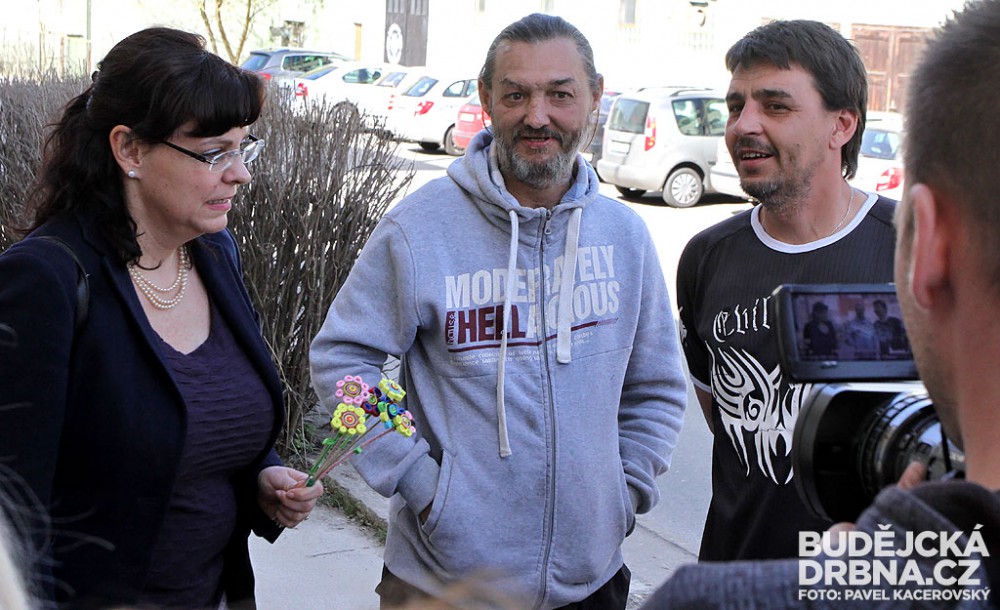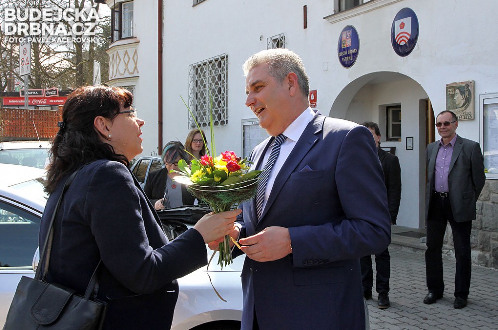 Antonín Krák přivítal Michaelu Marksovou Tominou před obecním úřadem