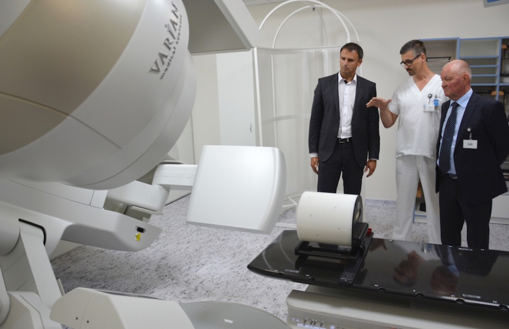 Při prohlídce nového lineárního urychlovače hejtman Jihočeského kraje Jiří Zimola, primář onkologického oddělení Václav Janovský a předseda představenstva nemocnice Břetislav Shon