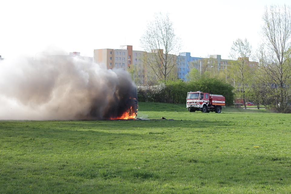 Požár vraku autobusu na louce u Vltavy v Českých Budějovicích