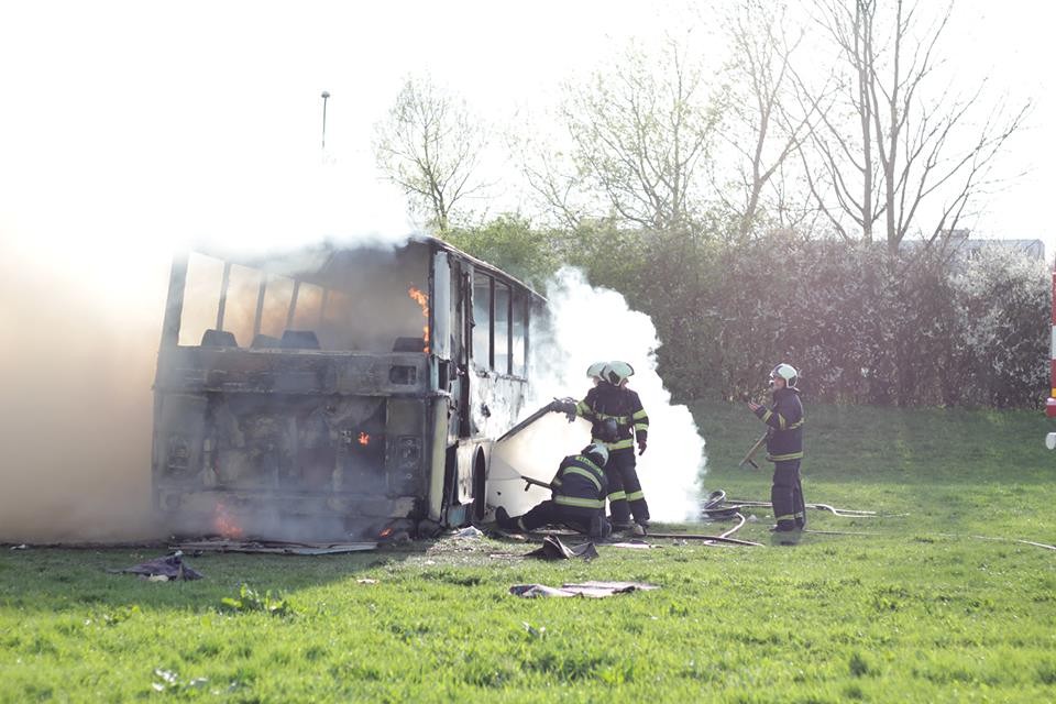 Požár vraku autobusu na louce u Vltavy v Českých Budějovicích
