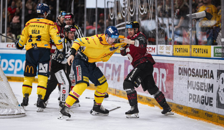 Branky a nahrávky: 6. Pysyk (Shore, Řepík), 19. Vesalainen, 23. Shore (Chlapík, Krejčík), 25. Shore (Řepík, Chlapík) - 17. Harris (N. Olesen, F. Přikryl), 59. Štencel (F. Přikryl, Hoch), 60. M. Beránek (Lantoši, Harris). Rozhodčí: Šír, Cabák - Hynek, Maňák. Vyloučení: 4:5, navíc Raška - Kachyňa oba 5 min. Využití: 2:1. Diváci: 16.066.