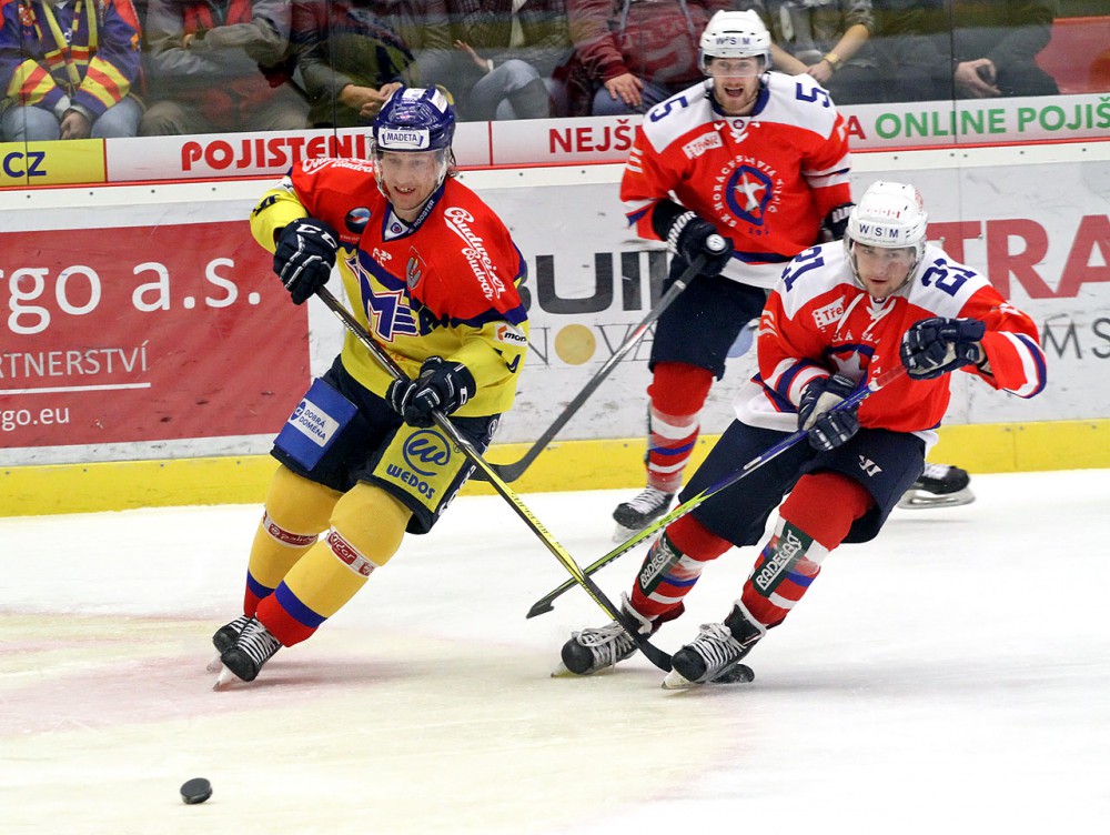 Filip Novák stíhá kotouč společně s Petrem Kratochvílem