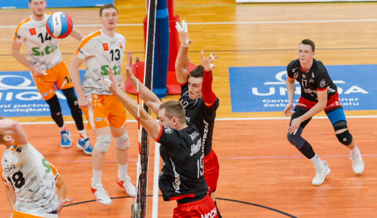Domácí volejbalisté šli od začátku za postupem. Do tempa se dostal uzdravený Šotola, svou příležitost na hřišti využil také Zmrhal, oba zatížili konto soupeřů pěknou řádkou bodů. Středočeši střídali na nahrávačském postu bratry Rosenbaumy, ale Jihostroj se nenechal vyvést z míry a předváděl pestrou hru s minimem chyb. Po prvních dvou sadách dostali na obou stranách prostor hráči z lavičky.