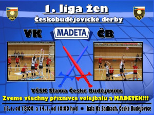 Předkrm před sobotním utkání o první místo v extralize mužů mezi Jihostrojem a Duklou Liberec (18) nabídnou budějcké volejbalistky. Městské derby v první lize žen sehraje VŠSK Slavia PF s Madetou dnes v 18 hodin, zítra je na programu odveta v 10 hodin. Oba zápasy hostí Slavia v hale Na Sádkách.