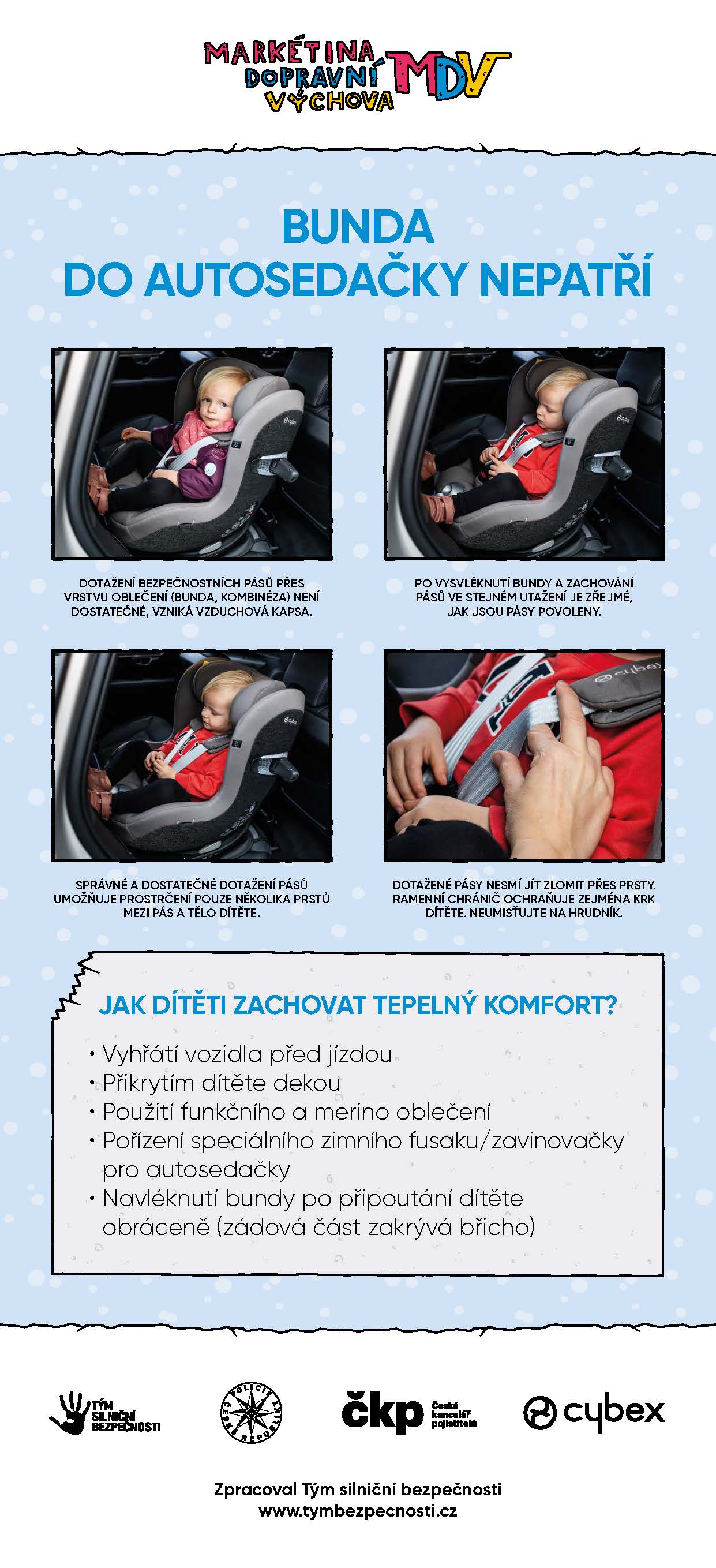 Před jízdou bundu dítěti sundejte a po správném připoutání jej přikryjte dekou nebo kabátkem. „Osvědčený trik je obléknout bundu obráceně – dítě sedí připoutané, ruce má v rukávech, a zadní část bundy použijete jako deku přes tělo. Jakmile se auto zahřeje, můžete ji snadno sundat,“ radí Markéta Novotná, metodik dopravní výchovy Týmu silniční bezpečnosti.