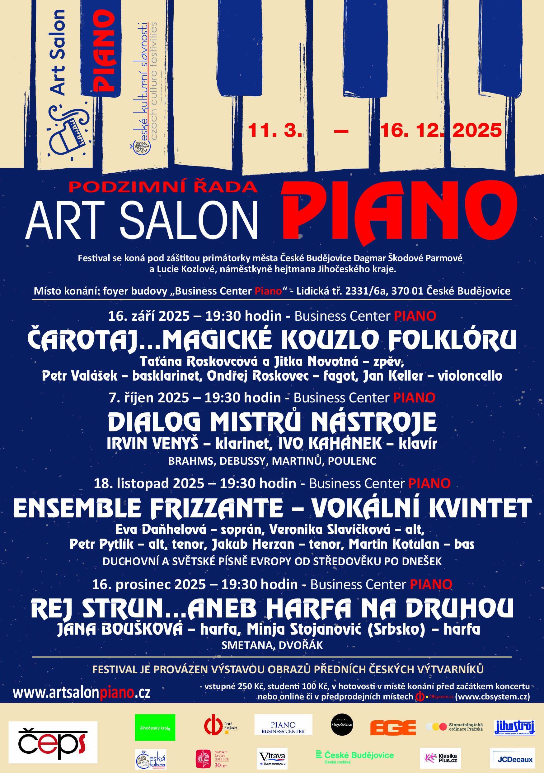 Art Salon PIANO - festival komorní hudby, mluveného slova a výtvarného umění je pokračováním úspěšného mezinárodního multikulturního projektu, který rozšiřuje kulturní platformu Českých Budějovic o oblast koncertů všech žánrů od klasiky po jazz. Atmosféru večerů příjemně doplňují průběžné výstavy obrazů a fotografií.