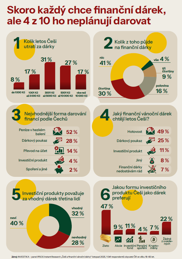 Třetina Čechů (32 %) považuje investiční produkty za vhodný vánoční dárek, ale 40 % o tom nikdy nepřemýšlelo. Pokud už investiční dárek, pak nejčastěji zlato (47 %), následují fondy a akcie (20 % dohromady). Kryptoměny nebo penzijní spoření zvažuje téměř každý desátý. „Zlato se k Vánocům hodí nejen esteticky, ale je také symbolem bohatství a trvalé hodnoty. Zlaté slitky jsou tradiční investiční aktivum, dlouhodobě uchovávají hodnotu a mají dobrou likviditu. Investiční zlato navíc není zatíženo DPH,“ doplňuje Milan Růžička, místopředseda představenstva a spoluzakladatel společnosti INVESTIKA.