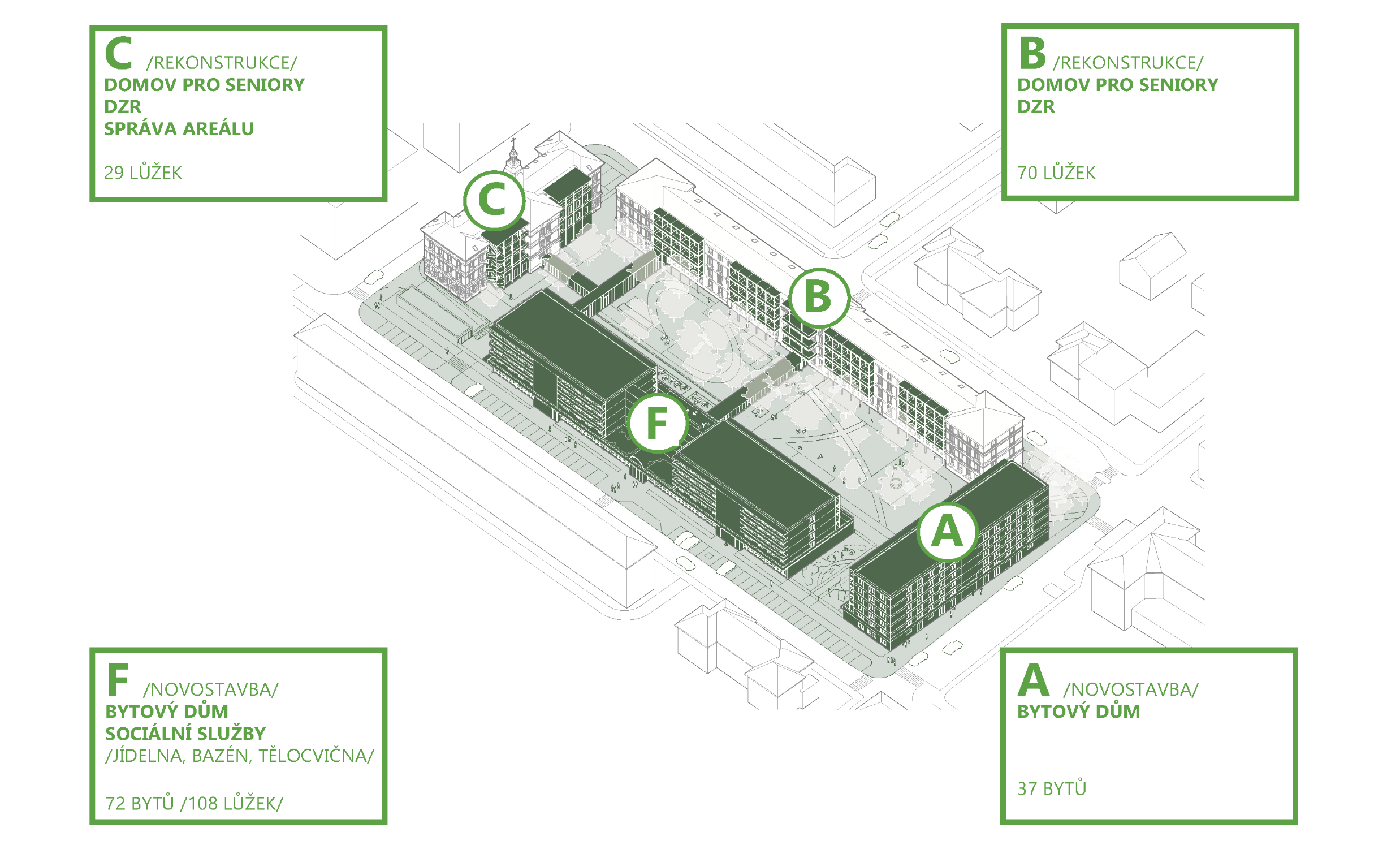 Komplex budov po dokončení nabídne 99 lůžek v domovech pro seniory a osoby se zdravotním postižením, včetně klientů s neurodegenerativními onemocněními, a také 72 bezbariérových bytů.