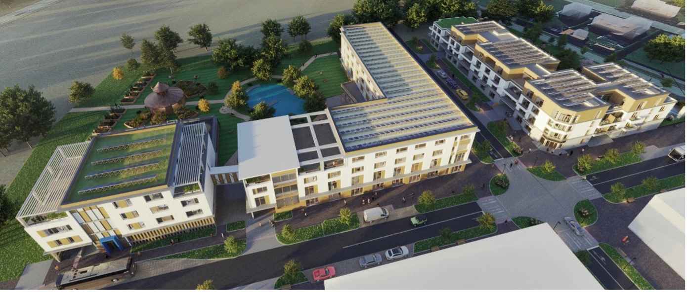 Vizualizace projektu IGF Třeboň.Součástí projektu je také polyfunkční budova, jejíž výstavba započala začátkem dubna. Ta rozšíří celý areál o služby, které budou přirozenou součástí každodenního života. Vzniknou zde ordinace, kanceláře, dětská skupina a parkovací místa. Celý prostor doplní také kavárna a odpočinkový park.
