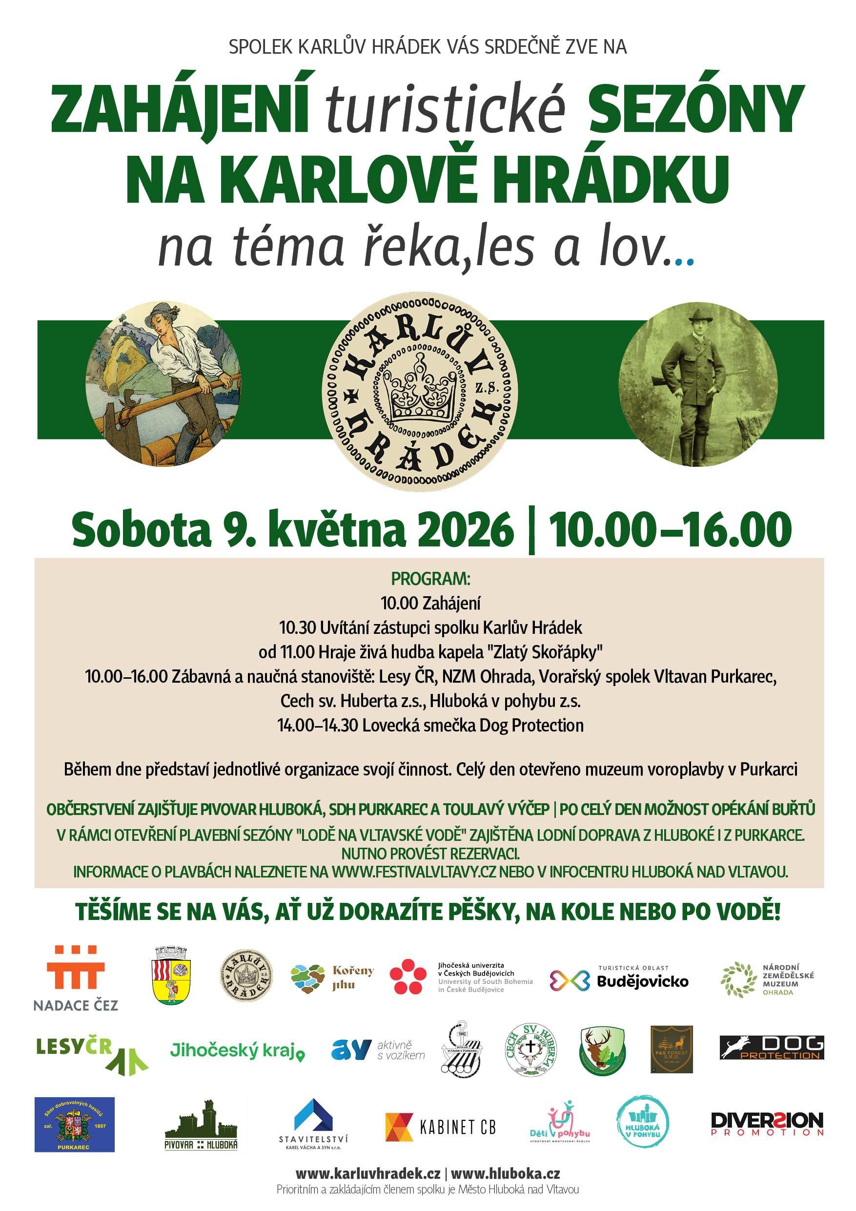 Program akce začne v 10.00 uvítáním zástupců spolků a města. Po celý den bude hrát živá hudba skupiny „Zlatý Skořápky“. Mezi 10.00 a 16.00 budou v předhradí připravena zábavná a naučná stanoviště partnerů akce – Lesy ČR – lesní správa Hluboká nad Vltavou, Národní zemědělské muzeum Ohrada, Vltavan Purkarec, Cech sv. Huberta a Hluboká v pohybu. Návštěvníci se mohou těšit na interaktivní ukázky činnosti a program pro děti i dospělé.