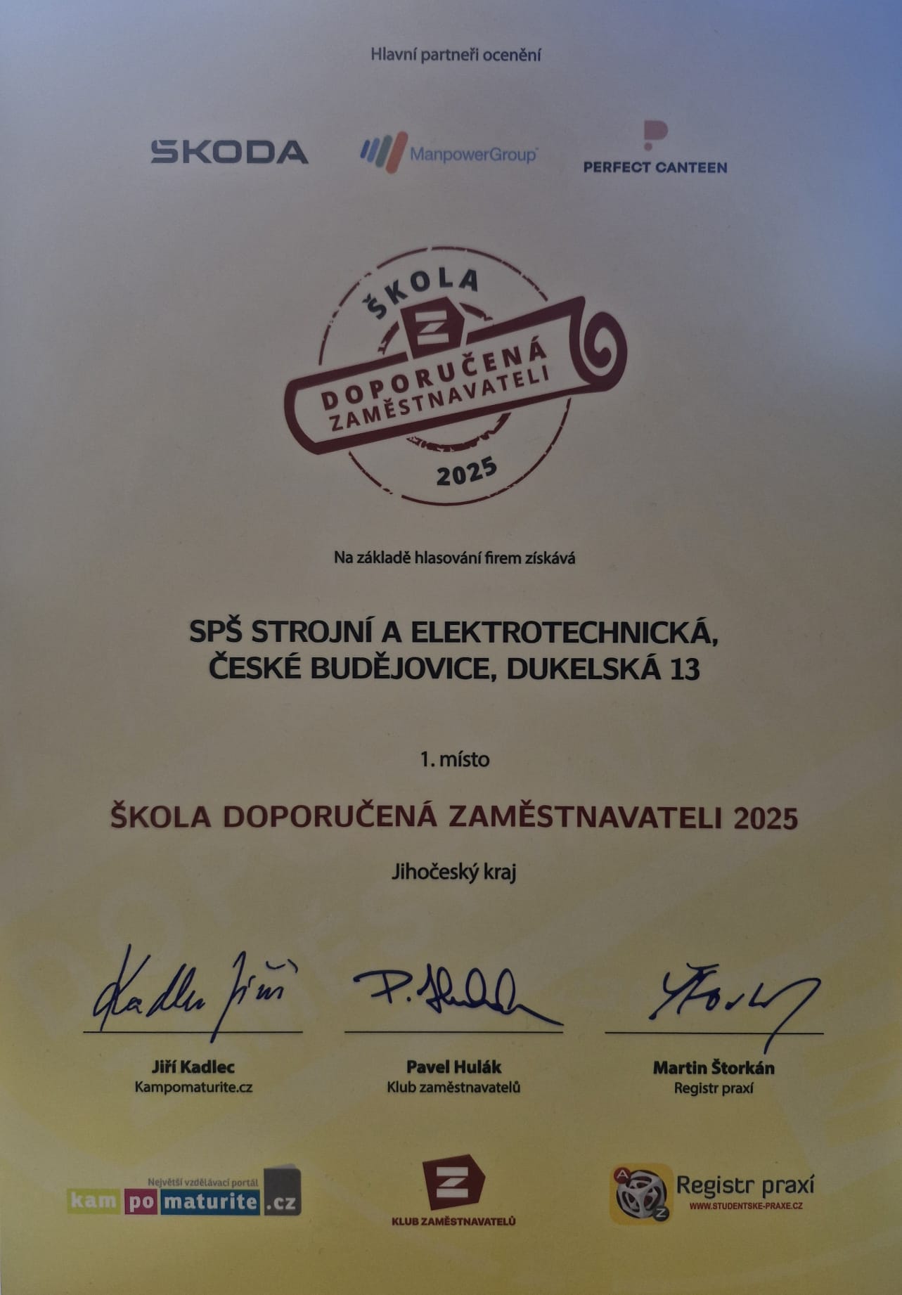 O kvalitě součinnosti školy s praxí svědčí také 1. místo SPŠ SE v Jihočeském kraji v anketě Škola doporučená zaměstnavateli za rok 2025. Výsledek vychází z hlasování samotných firem a navazuje na úspěchy z předchozích let, kdy se škola umístila na 3. a 2. místě. Tato skutečnost je o to cennější, že většina absolventů školy pokračuje ve studiu na vysokých školách, a přesto zůstává SPŠ SE pro zaměstnavatele respektovanou a doporučovanou institucí.