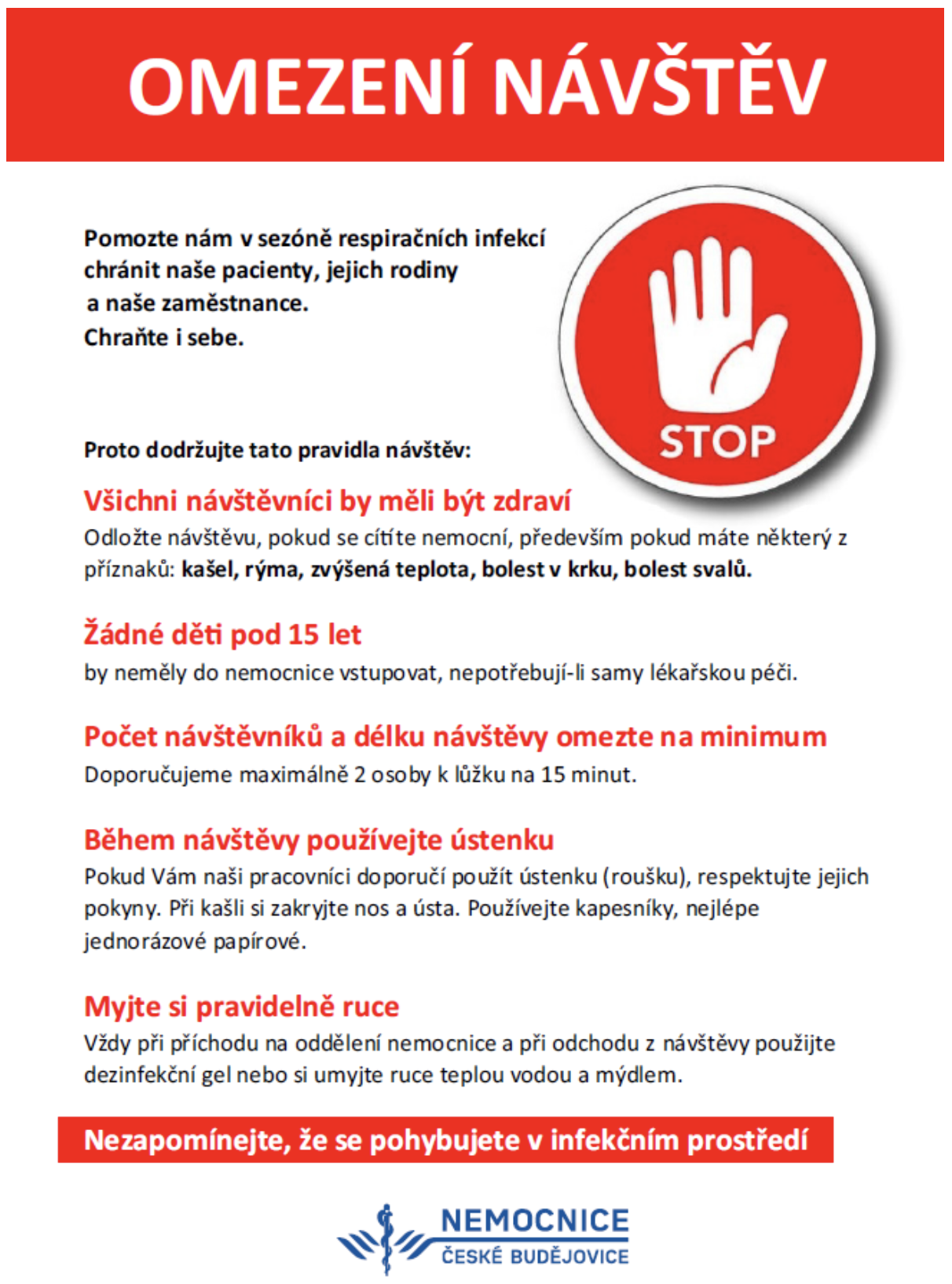 Nemocnice zároveň apeluje na to, aby byla každá návštěva co nejkratší a s minimálním počtem lidí. „Doporučujeme maximálně 2 osoby k lůžku na 15 minut,“ oznámila. Všechny, kdo do nemocnice míří, také vyzývá k nošení ochrany dýchacích cest, pokud to zdravotníci doporučí. „Pokud Vám naši pracovníci doporučí použít ústenku, respektujte jejich pokyny,“ stojí v pravidlech. Lidé by měli při kašli zakrývat ústa a nos, používat papírové kapesníky a dbát na jejich hygienickou likvidaci.