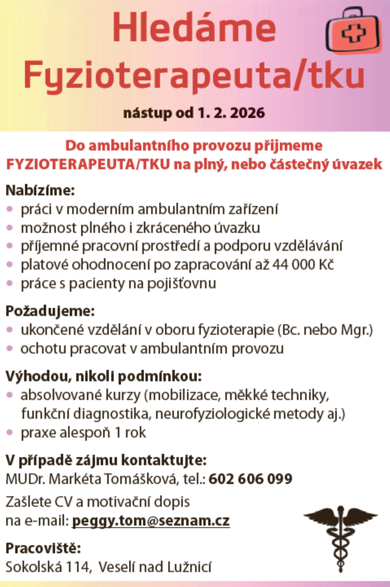 Na oddělené pracoviště ordinace ve Veselí nad Lužnicí je hledán fyzioterapeut či fyzioterapeutka. Zájemci se mohou stát součástí týmu Rehab Centra a pracovat v příjemném a moderním ambulantním prostředí. Rehab Centrum nabízí svým kolegům nejen atraktivní platové ohodnocení, ale také podporu vzdělávání a možnost plného i zkráceného pracovního úvazku.